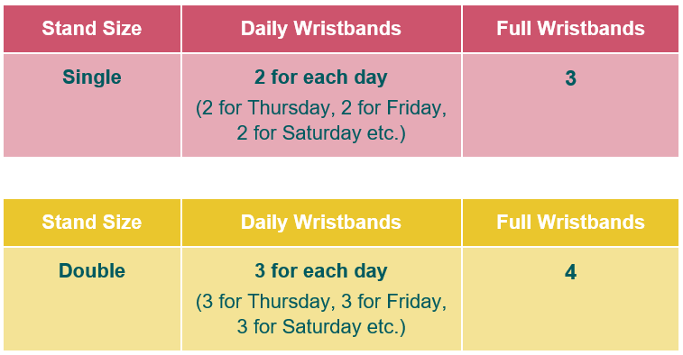 Wristbands will be available for collection onsite Tuesday 27th and Wednesday 28th May from the Food Village organisers office.