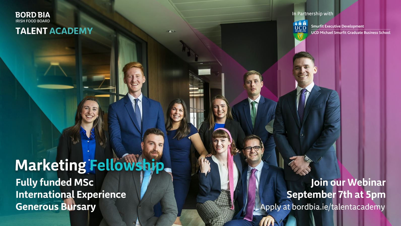 As part of Bord Bia’s Talent Academy – The Marketing Fellowship offers a fully-funded Master's qualification from UCD Michael Smurfit Graduate Business School and unique, extensive overseas experience in the areas of sales, brand & digital marketing, consumer insights, entrepreneurship and leadership. In addition, you receive a monthly bursary.