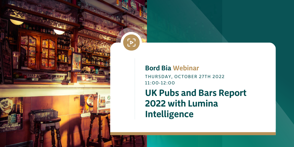 On Thursday 27th October, Bord Bia invites you to join us for a webinar debrief on the UK pub and bar market in conjunction with Lumina Intelligence. Lumina will present a comprehensive overview of the market in the UK, including a market sizing, the competitive landscape, consumer insight/trends, utilising menu analysis & trends and the future outlook for the sector with implications for Irish suppliers.