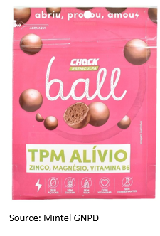 Chocolate is considered a traditional craving at this time, and some manufacturers are adding ingredients that can further help with mood. An example below is Chock #SemCulpa TPM Alívio Chocolate Ball from Brazil.