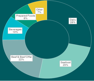 The main categories exported to Spain in 2019 in value were Dairy (28%), Seafood (26%) and Beef (22%):
