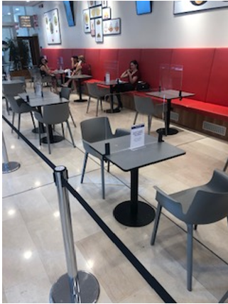 Plastic dividers on table to provide safety while customers opt to stay away.
