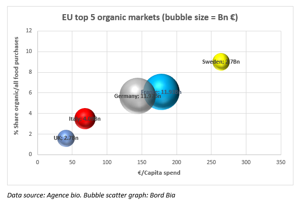 The market share of organic food as part of overall food purchases in France is 6.1% compared to 5.7% in Germany and an impressive 9% in Sweden which has the highest purchasing share of organic food and demonstrates the continued potential for growth in other markets.