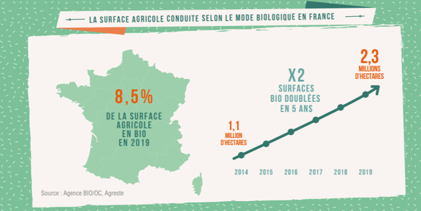 The surface of agricultural land for organic production in France has doubled in 5 years from 1.1 M Ha in 2014 to 2.3 M Ha in 2019 which represents 8.5% or the overall agricultural surface and contributes to the healthy market growth due to a greater and more structured offer.