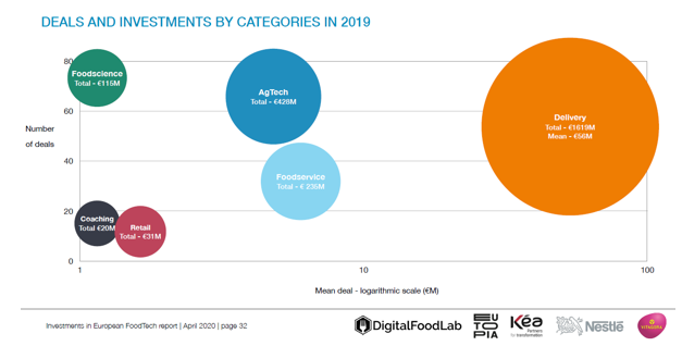 According to Digital Food Lab’s latest “Foodtech in Europe” report, 2019 was a record breaking year for European Food tech with 2.4€Bn euros being raised from private capital, 70% more than in 2018. The top 4 funding deals concerned delivery: Deliveroo (UK), Glovo (Spain); Picnic (NL), Wolt (Finland).