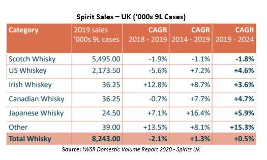 The continuing decline in consumption of blended Scotch is the primary reason for Scotch’s stagnation. People are generally drinking less overall but blended Scotch is falling out of favour as consumers trade up to malts or turn to other categories such as Gin which remained the fastest growing category in 2019 growing +5.4%.