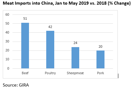 Total meat imports into China are growing strongly with beef and poultry imports showing the strongest growth according to GIRA. Up to the end of May beef import volumes were running over 50% ahead of the same period in 2018 with poultry 42% higher and sheepmeat rising by 24%. These trends seem set to continues for the rest of 2019 and into 2020.
