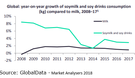Shortages in oat milk across the US and UK during March 2018 provided proof that consumer demand exceeded supply. In response to these shortages, and in order to future proof consumer demands for Oat milk, Otaly, the vegan milk brand increased production by 1,250% (Laurence, 2018)5. The year-on-year growth rate of soymilk consumption remains higher than milk across the last 10 years and the overall market value in the milk industry has almost doubled since 2007 ($8,157m to $13,659m in 2017), further illustrating the potential of plant-based dairy products (GlobalData, 2018)6.