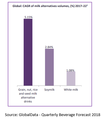 The alternative milk market can cater to consumers looking for engaging experiences with a broad repertoire of varieties including almond, oat, rice, coconut, pea, quinoa and hemp. “Based on the slightly different flavour of each, anecdotally it seems that some consumers even prefer different milks for different uses” (GlobalData, 2019)8. A number of online guides which offer consumers help in deciding which milk alternative to use when, are now available online. Nestlé Professional in Australia has produced a Barista’s guide to Popular Plant Based Milk Options (Nestle, 2019)9. Whilst guides on pairing alternative milks with cereals (STAROSTINETSKAYA, 2019)10, and for use as an ingredient (Parsons, 2019)11 can also be easily accessed through a quick Google search. Grain, nut, rice and seed milk alternatives are expected to grow more than three times as fast as white milk and almost double the growth rate of soymilk until 2022 (GlobalData,2018)12. GlobalData says that the wide variety of uses available may be a key driver of this future growth.