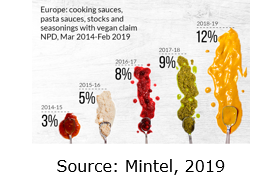 To meet the expectations and needs of consumers in a market that is significantly shaped by dietary trends, pasta sauces must cater for the copious dietary requirements that are emerging among consumers. Between vegetarian, vegan and flexitarian diets the demands appear endless, but Mintel (2019) indicates how this can be an opportunity for suppliers of pasta sauces. Vegetarians and vegans are looking to add rich ingredients to their diet to replace what has been eliminated. A convenient solution to this could be flavoursome vegetarian and vegan pasta sauces that offer rich flavour and vibrant, wholesome ingredients. Bold flavour profiles are being explored in vegan sauces to ensure plant based meals will not lack tastiness. (Mintel, 2019) The European growth in sauces with a vegan claim has more than tripled over the last five years which is illustrated in the image below.