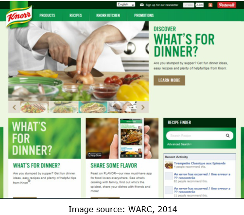 To illustrate, in 2014 Knorr led a campaign in Canada to target mothers of children under 12. This campaign positioned the product as being a solution to the “what’s for dinner?” question, with recipe cards and a mobile recipe app which could be customisable by retailers. Digital ads, websites, email and social media were used to promote the campaign. Users were encouraged to share their pictures of cooking on social media (Warc, 2014).