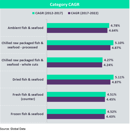 Per capita consumption of fish & seafood in Japan is 48Kg per person per annum, which is one of the highest in the world. Processed ‘Chilled raw packaged fish & seafood’ is the largest category with value sales of J¥284.3 billion (€2.42 billion) in 2017. The ‘dried fish & seafood’ category is forecast to grow the fastest at a CAGR of 4.87% during 2017–2022. It is followed by ‘chilled raw packaged fish & seafood - processed’ (4.87%) and ‘ambient fish & seafood’ (4.64%). See Table 1 below