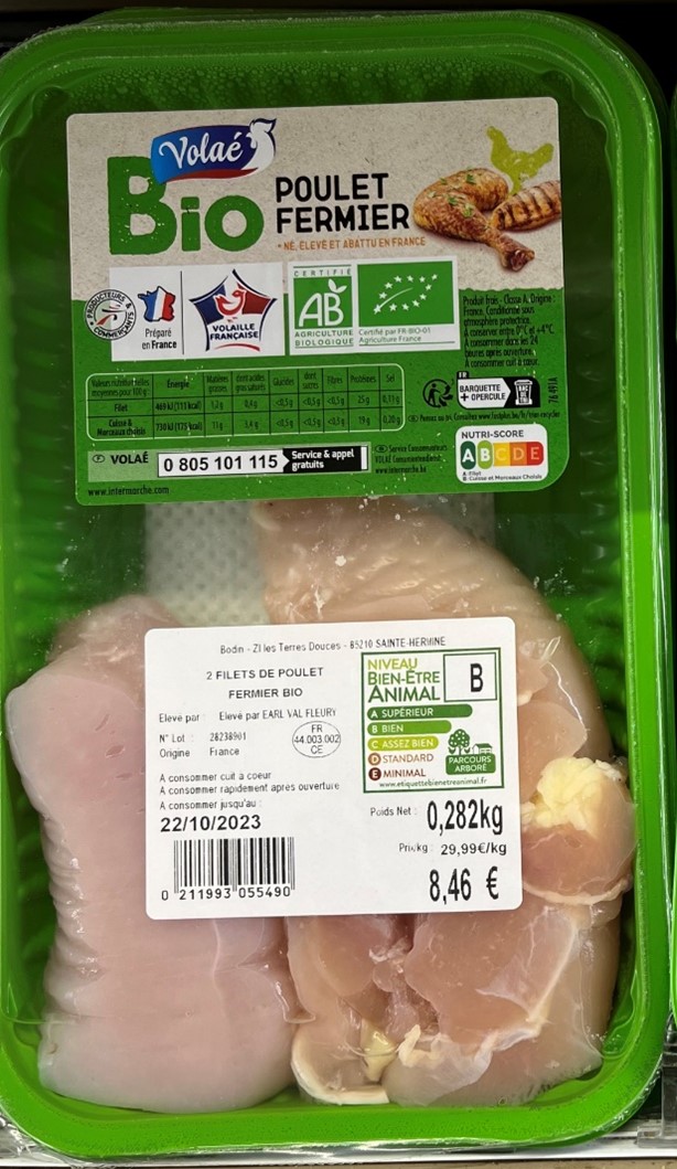 Figure 3: Organic chicken sold in Monoprix with an animal welfare score of B. Source: Germain Milet Bord Bia