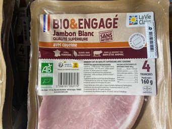 Figure 2: This organic sliced ham has multiple claims including nitrite free, Made in France, antibiotic-free, recyclable packaging, and animal welfare. This highlights how organic alone is often not enough in persuading consumers to purchase. Source: Órla Murphy Bord Bia