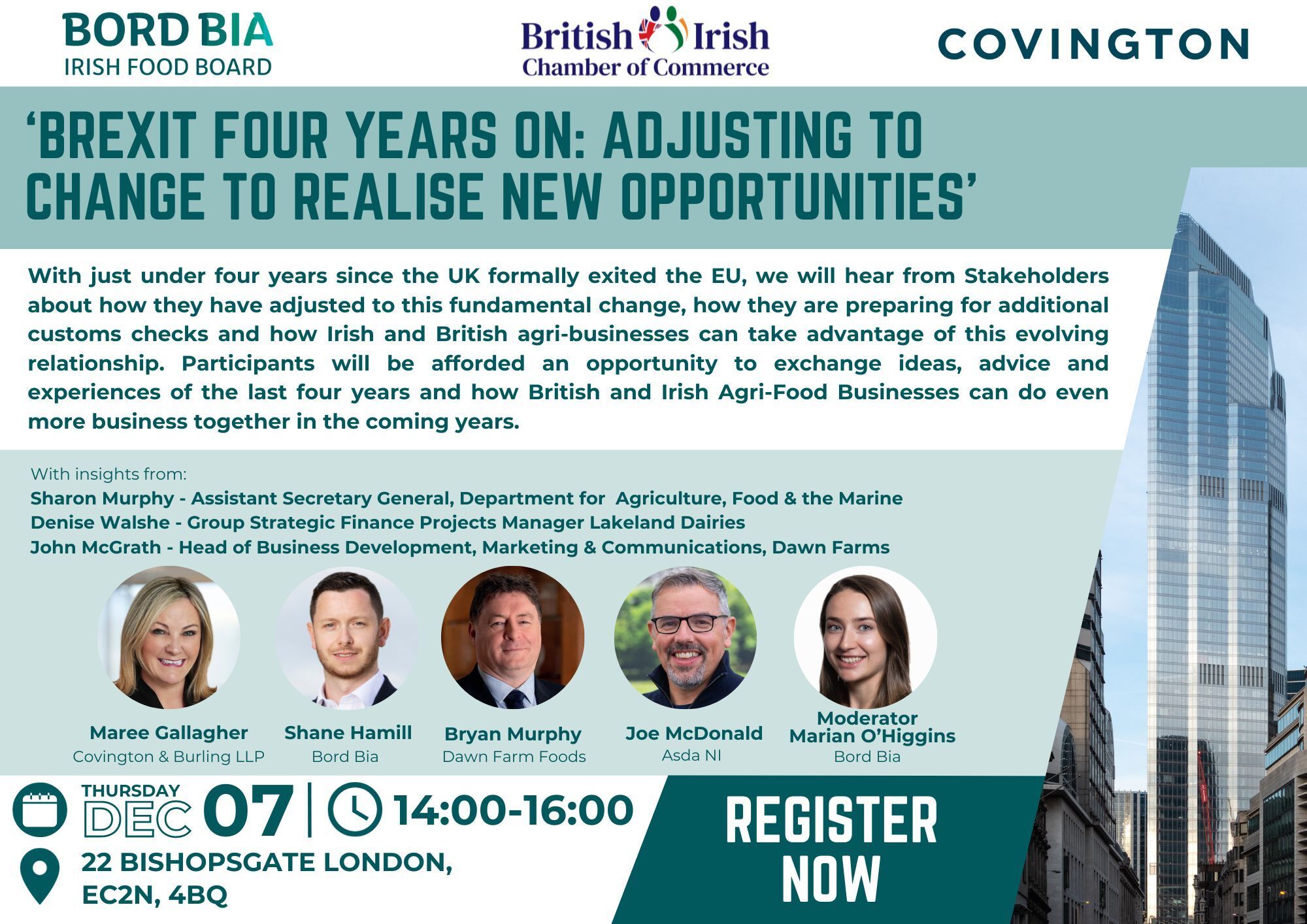 Bord Bia and the British Irish Chamber of Commerce is hosting a panel discussion on the topic of “Brexit Four Years On: Adjusting to Change to Realise New Opportunities”.