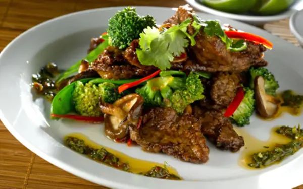 Coat the beef in the seasoned cornflour and stir-fry, in batches, until crispy. Remove to a dish and keep warm while cooking the vegetables.