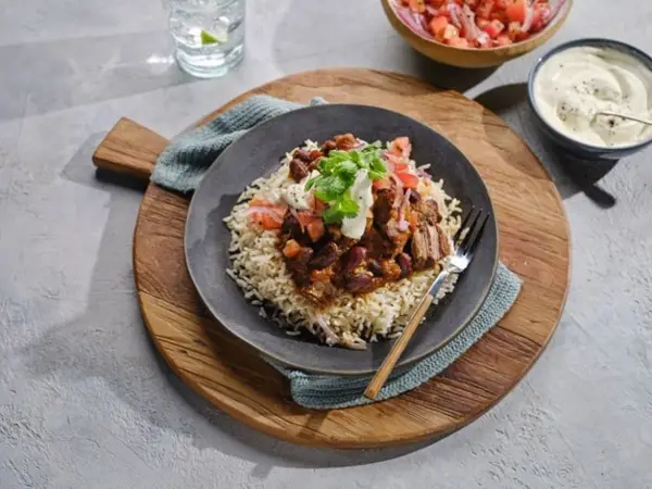 To serve: Sprinkle the coriander over the beef and serve with the rice, salad and soured cream.