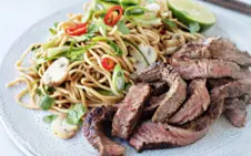 Add the meat back into the wok then add the sauce mixture. Cook for 2-3 minutes until the sauce is heated and well mixed through the mince. Then add the noodles, cabbage, carrots and radishes. Stir to combine then remove from the heat.