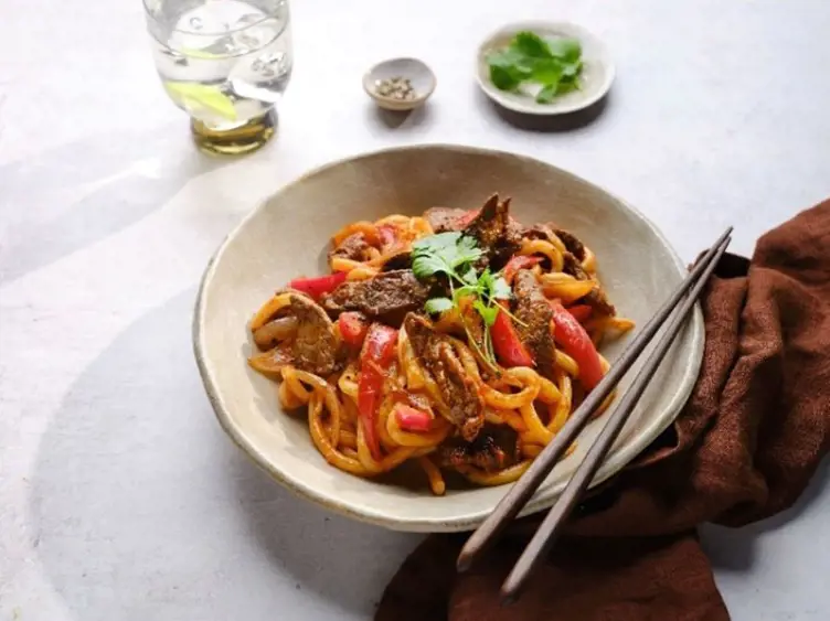 To make the sauce: In a small bowl mix together all the sauce ingredients. Then stir the sauce through the beef and vegetables in the pan. Add the noodles and stir well to combine. Cook for a further 2-3 minutes to heat through. Taste and season.
