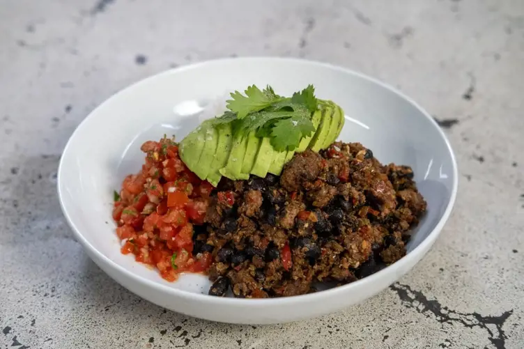 Mark’s Quick Beef Chilli, Egg, Pico de Gallo and Rice