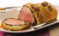 Cut four cases to fit four small/individual greased baking tins. Leave the pastry lid to one side. Fill with the beef mixture and then drape a pastry lid over them. Trim the excess and pinch around the edge. Make a hole in the centre to let out the steam.