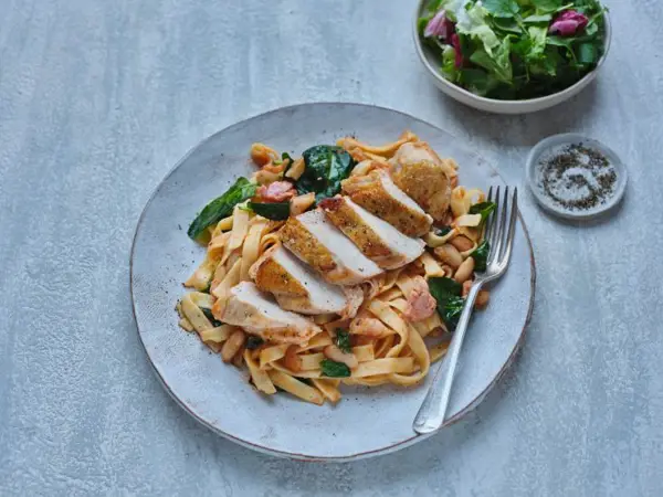 To cook: Add the chicken to the casserole and place, uncovered, in the preheated oven. Roast until the chicken is cooked through. This will take about 30 minutes. Remove from the oven, take out the chicken and stir the spinach leaves through the sauce.