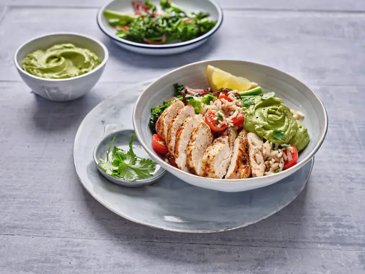 Place the cooked rice in a mixing bowl. Add the tomatoes, juice of half the lemon, salt and pepper and mix well. Set aside a little coriander to sprinkle over the final dish, add the rest to the rice and mix. Then divide the rice between four serving bowls and add the broccoli and onion mixture. Slice the chicken and add to the bowls. Spoon on some avocado dressing, a squeeze of remaining lemon juice and a sprinkle of coriander leaves.