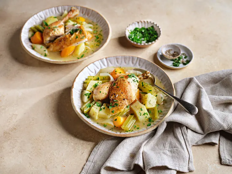 To serve: Remove the chicken from the casserole to a carving board. Taste the broth and season if necessary. Sprinkle in some chopped parsley then serve the sliced chicken with the broth and vegetables.