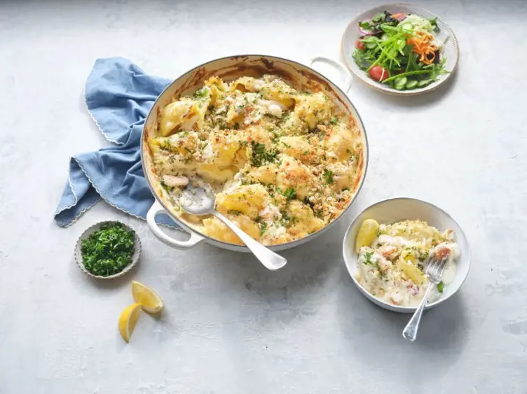 To assemble: place the pasta back in the saucepan, then mix through the cheese sauce and lemon juice. Fold in the crabmeat. Season and taste. Pour the mixture into an ovenproof dish.