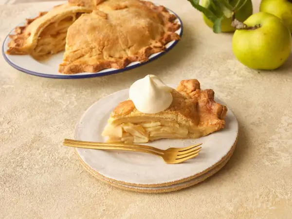 Cut the pastry in half and roll one piece out on a floured work surface and use to line the bottom of a 23cm ovenproof plate or pie dish, leaving a 1cm overhang. Peel, core and cut the apples into slices and mix in a bowl with the caster sugar, cinnamon, cloves and lemon juice. Transfer to the pastry lined plate.