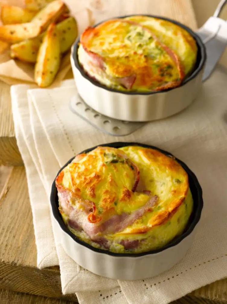 Grease 4 x 12cm round ovenproof dishes or a 26cm quiche dish. Line the base and sides with the rashers. (Loose bottom tins are not suitable as the mixture will leak out.)