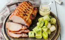 Return the bacon to the saucepan, add the cider and place, uncovered, in the preheated oven. Roast for a further 20 minutes basting from time to time. Remove the bacon from the saucepan and keep warm.