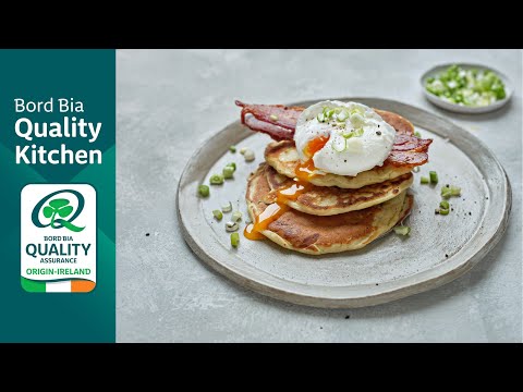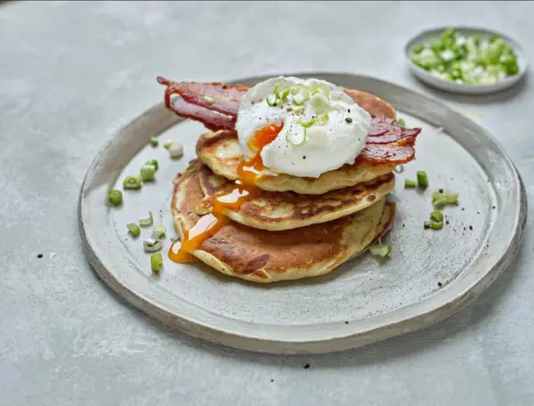 To serve: Divide the pancakes between four serving plates. Top with crispy bacon and a poached egg.