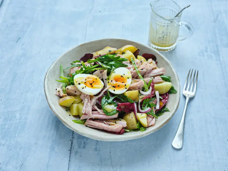 Place the leaves, red onion and mange tout in a bowl. Add a tablespoon of dressing and mix well. Divide between four dinner plates or bowls. Top with the potatoes, shredded bacon and eggs. Drizzle over some more dressing and sprinkle on some nigella seeds.