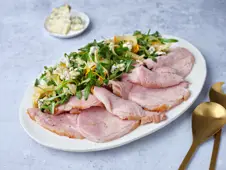 To serve: Top with chunky pieces of the ham and nuts, and drizzle over more dressing. Bring to the table and let everyone help themselves. Alternatively divide the salad between 4 plates.