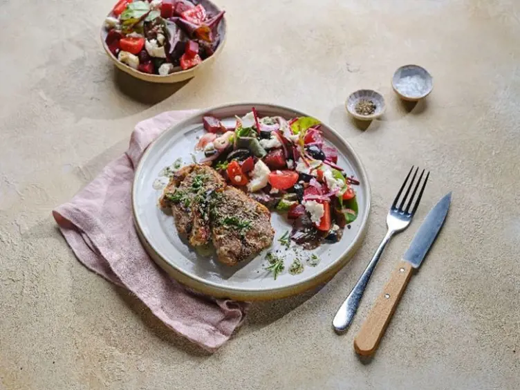 To make the salad: Toss together the salad ingredients with half the cheese in a large bowl. Then mix the dressing ingredients, taste and season. Pour half the dressing over the salad and mix well. Keep the rest of the dressing to drizzle over the chops.