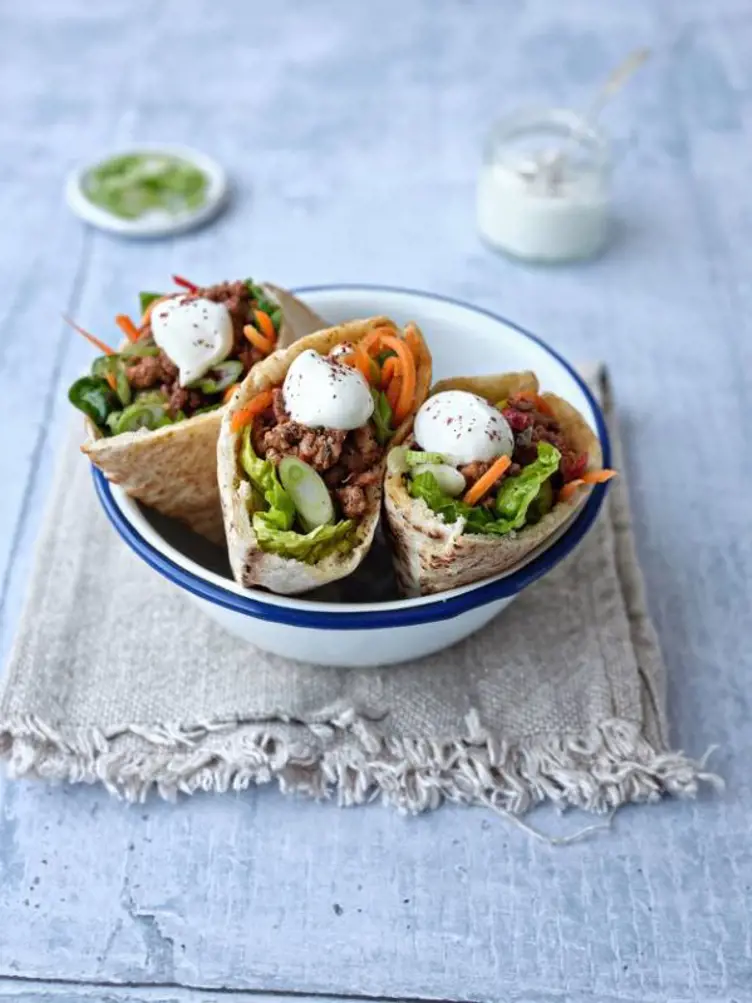 To serve: Toast the pitta bread. Cut across the middle. Make a pocket and then add a little lettuce and salad to each half of the pitta, top with the mince mixture. Drizzle over some yogurt and sprinkle with a little sumac.