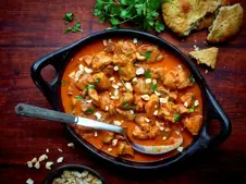 Cook the rice as per packet instruction. Sprinkle some coriander over the curry and serve with a lightly dressed green salad.