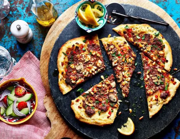 Slice the remaining mushrooms. Sprinkle the pizzas with the sliced mushrooms, feta and pine nuts and a drizzle of oil.