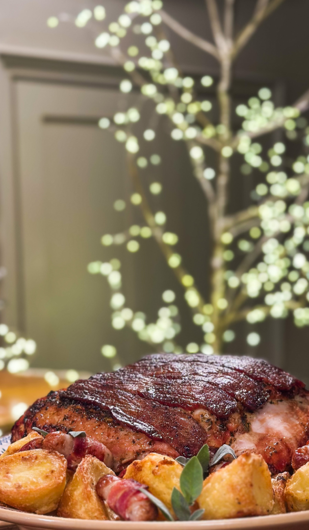Rub the prepared flavoured butter generously over the skin, this is best using gloves. Cover the top with streaky rashers.