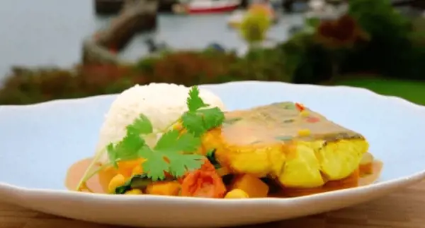 Once the curry has come to the boil, carefully place the hake portions on top and cover with the lid. Reduce the head to a low to medium and slowly poach the hake for 15 minutes, until cooked through.