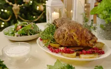 The lamb can be roasted or barbecued. If roasting set the oven to Gas Mark 6, 200ºC (400ºF). Heat a large pan, place the lamb on the hot pan, season and brown well on both sides then place on a roasting dish and cook for 45 mins. approx for pink lamb.