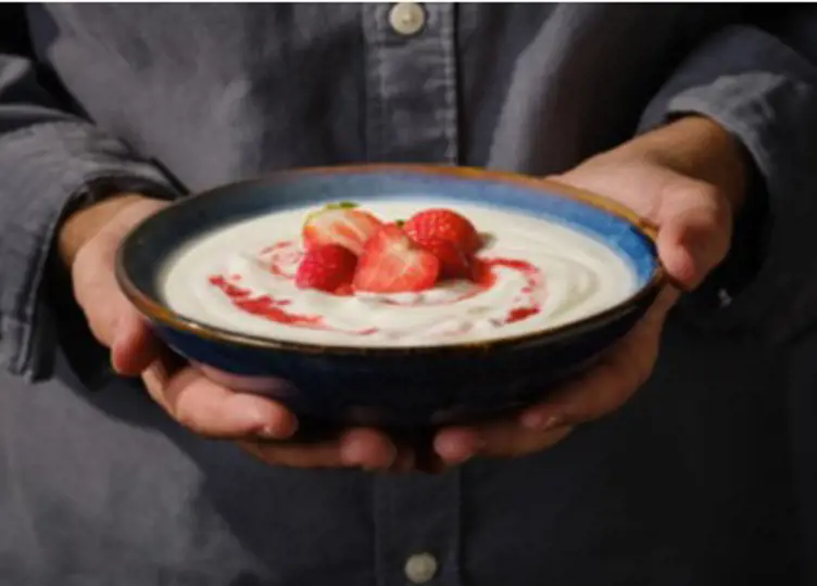 Mash some organic strawberries with a little sugar. Swirl the mixture through the organic yogurt and top with sliced strawberries or other organic fruit in season.