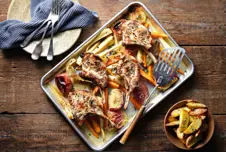 Heat the oil in a large wok. Add the courgettes, carrots, red onion and garlic and stir-fry for a couple of minutes until the vegetable soften. Season with a little salt and black pepper and serve with the chops, potatoes and reserved marinade.