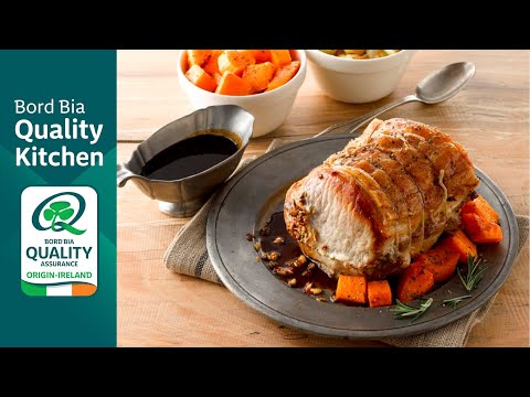 Roll the loin and tie at intervals with string. Place into a roasting tin. You can do this in advance and store in the fridge until you are ready to cook it.