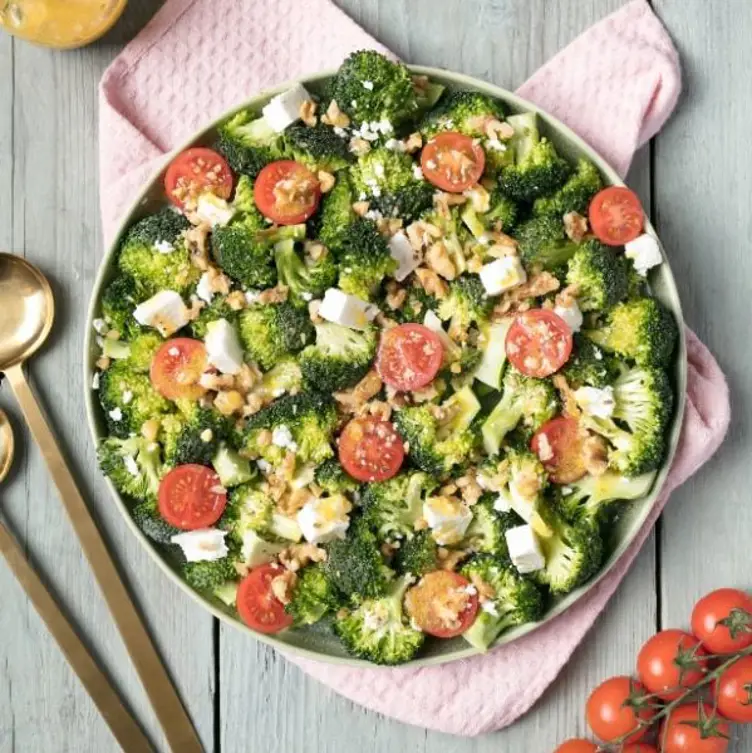 In a bowl, combine the nuts with the broccoli and cherry tomatoes. Add the Feta, drizzle over about of the dressing and toss to combine.