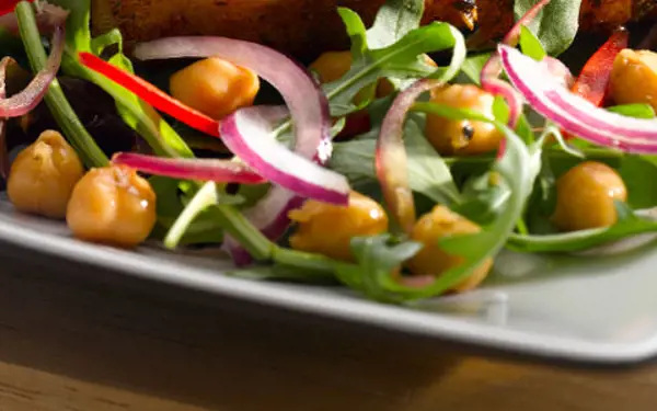 Place the onion, red pepper, chickpeas and salad leaves in a bowl. Combine the dressing ingredients then mix it through the leaves.