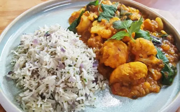 Arrange the Aubergine and Potato Dhansak on warmed plates with the Rice Pilaff. Garnish each plate with a dollop of natural yogurt and the coriander leaves.